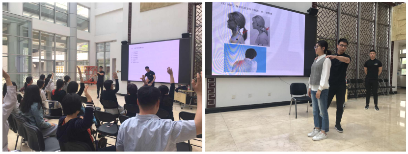 上课伊始,陈鹏教练针对教师职业常见病症如上交叉紊乱,进行了第一次课的讲解、指导与实操。陈教练对上交叉紊乱的表现、产生的原因、有效的处理方法进行了详细的介绍,通过演示文稿图示、现场演示等方式,为大家指出了错误的姿势和习惯,并为大家做正确的示范。讲解指导完毕,陈教练和助理为现场教师进行个体诊断,并结合本次课程内容进行了有效的放松、纠正等康复操作。