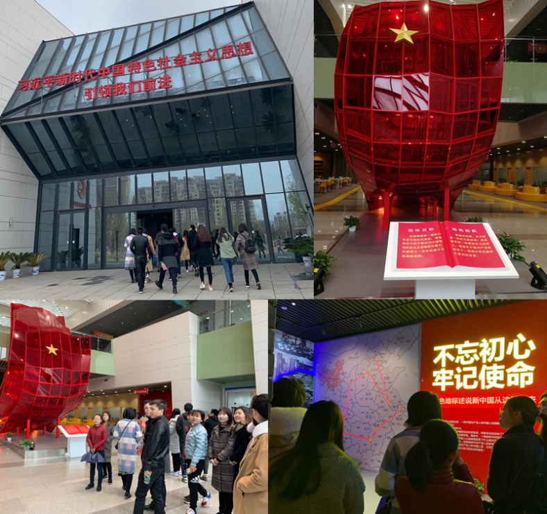 接下来,同学们参观了“不忘初心,牢记使命”的习近平新时代中国特色社会主义思想专题展区。十八大以来,我们党坚持稳中求进的工作总基调,开拓进取。在这里,同学们回顾了在党的领导下近五年社会主义现代化建设的历史性成就。中国特色社会主义拓展了发展中国家走向现代化的途径,为改善中国民生问题做出了贡献。我们党提出并形成了全面建成小康社会、全面深化改革、全面依法治国、全面从严治党的重大战略思想。同学们还具体学习了新时代中国特色社会主义思想核心要义和新时代坚持和发展中国特色社会主义的14条基本方略。