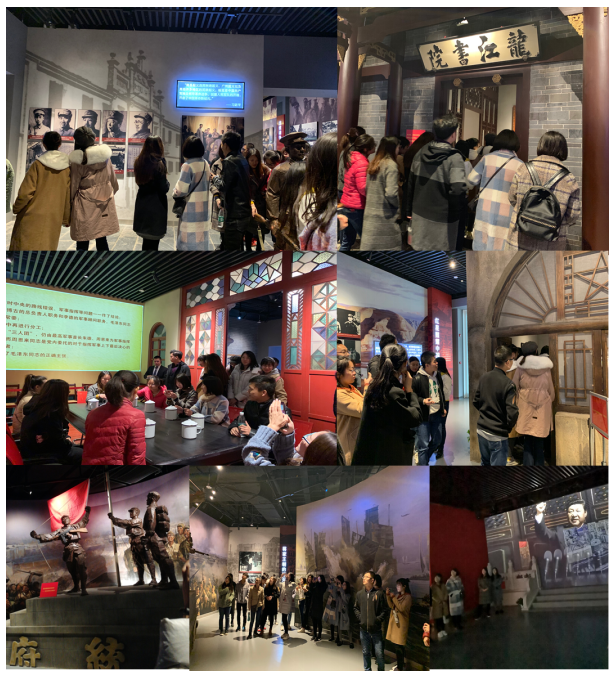 在党史情景教育基地,同学们通过回顾八大红色地标,将新中国的历史画卷深深刻印在心里。第一大地标“一大会址”,记录着中国共产党的根脉。同学们认真参观,不时记录着我党历史进程中的点点滴滴。第二大地标“南昌起义指挥部旧址”,在这里同学们看到参加南昌起义指挥部领导的照片,纷纷激动不已。第三大地标“龙江书院”,是井冈山会师时毛泽东、朱德会面的地方,也是中国革命第一次取得胜利休养生息的地方。同学们看到此情此景,心中的民族自豪感油然而生。第四大地标“遵义会议旧址”,是中国共产党历史上一个生死攸关的转折点,在这里,同学们身临其境的体验遵义会议现场,伴随着领导人的相继发言,投影在会议桌上的名签依次显现,引发同学们的连连赞叹。第五大地标“枣园窑洞”,在这里诞生了伟大的毛泽东思想。同学们近距离参观窑洞内毛主席编写的《矛盾论》、《反对写八股》、《论人民民主专政》、《关于正确处理人民内部矛盾的问题》等许多重要著作,并收听了毛主席和著名民主人士黄炎培在窑洞的对话。第六大地标“新中国的摇篮”,同学们在这里观看了毛主席在第七届二中全会的全息演讲视频,深深为毛主席运筹帷幄、指挥若定的风采所折服。第七大地标“蒋家王朝的覆灭”,这座建筑是南京总统府楼顶的一角,这里宣告了延续22年的蒋家王朝的覆灭和全中国的解放。第八大地标“翻开中国历史新纪元”,这个场景展现了在天安门城楼上和天安门广场的局部复原场景,5代国家领导人在天安门城楼阅兵的场景和历史不断闪现,辉煌的历史在同学们眼前一幕幕浮现,激发了同学们赤诚的爱国之心。