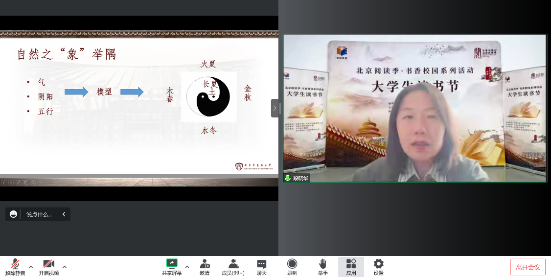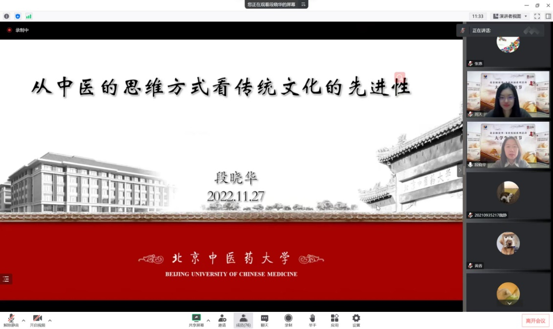 此次讲座中,段晓华老师以“中医的思维方式看传统文化的先进性”为题,从“象思维”的概念、文化渊源与特点,以及传统文化的先进性几个方面展开讲座。段老师以问题启发为主线,结合中医历史、时代背景、生活实例与青年责任,鲜活地阐释了中医的思维方式,并利用“象思维”的整体性、变易性、功用性、思辨性的特点来解读传统文化的包容、与时携行、经世致用、和谐有序。同时,段老师号召当代青年学子应深刻了解传统文化的内涵,担负起“运输”传统文化的历史重任。