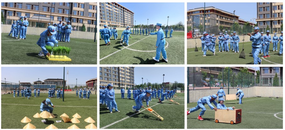 大生产运动体验活动,围绕抗日战争时期解放区军民发扬自力更生、艰苦奋斗精神掀起热火朝天的大生产运动背景,共设置插秧比赛、扁担接力、五谷丰登、推车运瓜、移动粮仓等五个项目。各军团同学们在“自己动手,丰衣足食”的号召下,通过接力形式快速将几十株秧苗插到“稻田”里;用扁担挑物体验劳动人民的辛苦;按照“故风雨时节,五谷丰登,社稷安宁”的顺序翻动草帽,还原丰收场景;用简易独轮车运送南瓜,提升团队合作与动手能力;把传统的粮柜按比例缩小并装上轱辘,通过接力传递让大家再一次体验丰收的喜悦。