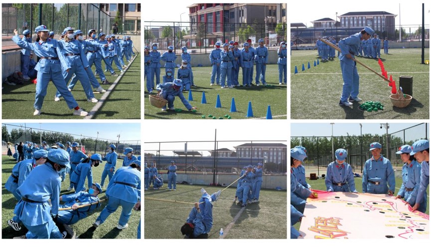 长征与抗战体验活动,围绕红军长征与抗日战争的背景,共设置精准投掷、排雷专家、打扫战场、红嫂抬伤员、荆棘取水、重走长征路等六个项目。各军团同学们在长征精神与抗战精神的引领下,认真学习投掷手榴弹的姿势,比拼投掷的距离和精度;排雷人员蒙眼从起点开始沿途寻找“地雷”并放入背篓,为团队进军排除隐患;用“巨型筷子”道具,以接力形式依次通过障碍清理战场;女同志扮演的“红嫂”,利用道具快速制作担架,将男同志扮演的“伤员”抬至指定位置,体会敌后战场的不易;通过团队协作,仅利用一根绳子跨过荆棘获得水壶,还原红军过草地时的艰难场景;团队成员通过调整画布高低、倾斜角度推动网球沿红军长征线路行进,从瑞金出发,经历“千难万险”,胜利会师,让大家学习到了迎难而上、砥砺前行的实践经验。