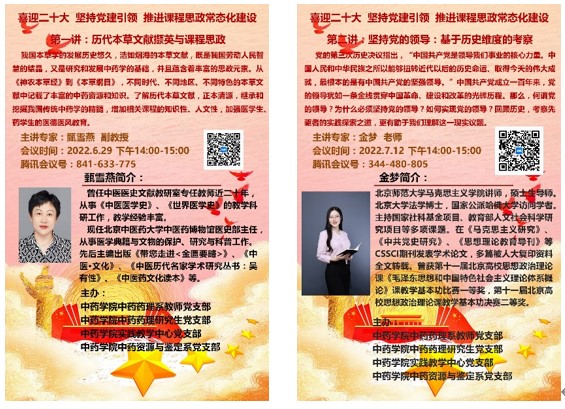 中药药理学是大学首批思政示范课程,授课教师一直积极推进课程思政建设,落实立德树人。2022年中药药理系教师党支部联合ylzzcom永利总站中药药理研究生党支部、实践教学中心党支部、中药资源与鉴定系党支部,获批党建项目化活动《喜迎二十大 坚持党建引领 推进课程思政常态化建设》。项目以“党对中医药的保护、传承和发展”为主题,开展了丰富多样的党建活动。于6月、7月分别邀请中医药博物馆甄雪燕老师、北京师范大学金梦老师分别作《历代本草文献撷英与课程思政》、《坚持党的领导:基于历史维度的考察》讲座。4个支部党员线上线下展开热烈的讨论,将思政建设作为塑造创新人才培养新动能的优势助力。