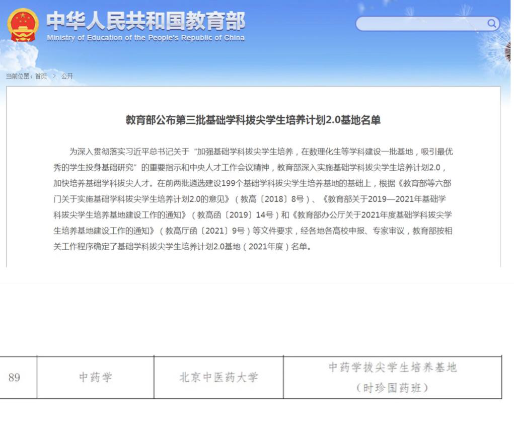 近日,教育部发布了《关于印发基础学科拔尖学生培养计划2.0基地(2021年度)名单的通知》,我中药学拔尖学生培养基地(时珍国药班)成功入选,这是我校首次入选国家基础学科拔尖学生培养计划。