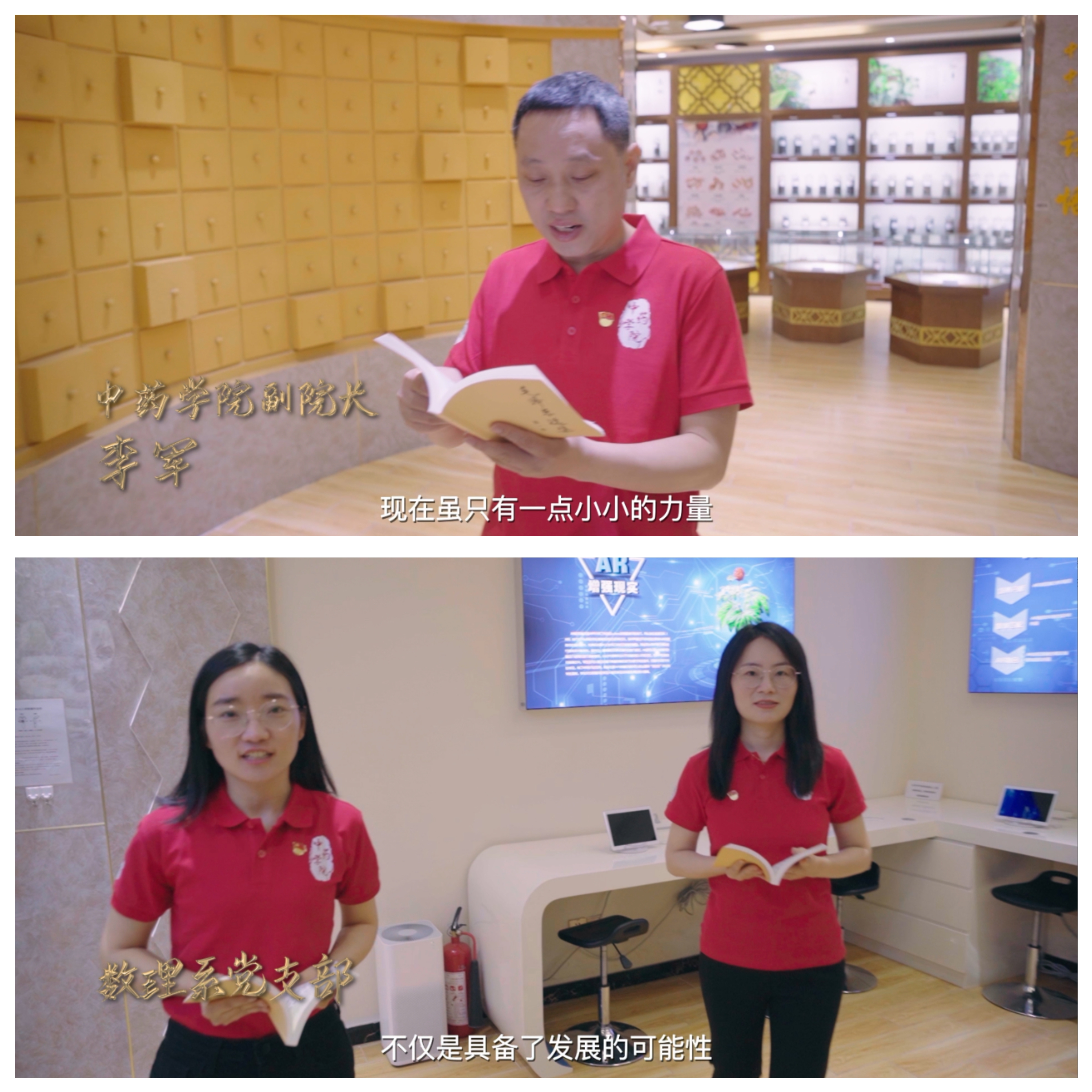 第一篇章“星火燎原”。李军副院长带领数理系党支部、综合管理办公室党支部、中药制药研究生党支部、中药信息学研究生党支部共读《毛泽东选集—星星之火,可以燎原》,感悟党在艰苦奋斗时期用点点星火凝聚起来的伟大力量;中药制药系党支部、实践教学中心党支部、中药炮制系党支部、中药信息学系党支部共读《可爱的中国》,致敬纯粹的中国共产党人和伟大的民族英雄。