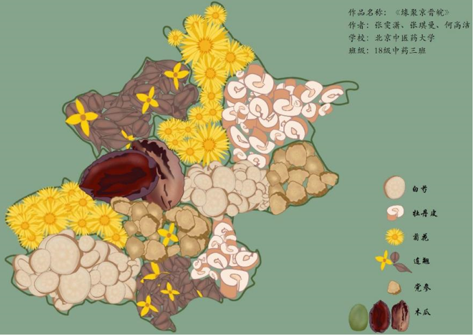 《缘聚京晋皖》组以3位团队成员所来自省份为题材,图中的北京地图由安徽的道地药材“四大皖药”【牡丹皮、木瓜(宣木瓜)、菊花(亳菊、贡菊、滁菊)、白芍(毫芍)】以及山西的道地药材【党参、连翘】填充,既体现了三位同学相聚北中医ylzzcom永利总站的缘分,也充分体现两省道地药材。