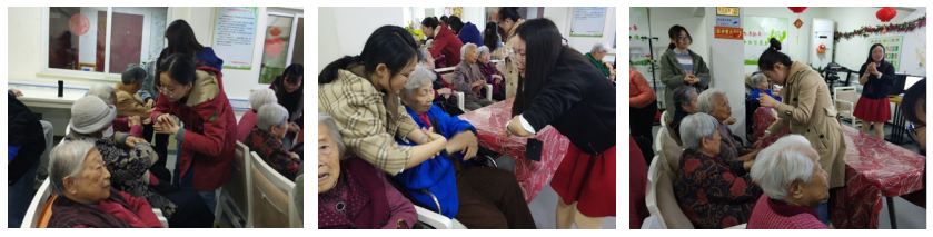 志愿活动从上午八点半开始,在接受了敬老院负责人的培训后,志愿者们正式与老人见面。志愿者们首先给爷爷奶奶们带来一堂生动又实用的中药养生保健知识讲座,老人们十分热情,积极与志愿者互动,志愿者们也一对一的耐心解答。讲座结束后志愿者为老人们测量血压,并详细记录测量结果,提供给敬老院相关负责人做参考。最后,在主持人的带领下,志愿者与老人们共同做了拍手操并合唱《甜蜜蜜》、《小城故事多》以及《粉红色的回忆》等经典老歌,爷爷奶奶们纷纷拍手叫好,将气氛推向高潮。志愿服务在一片欢歌笑语中圆满结束。