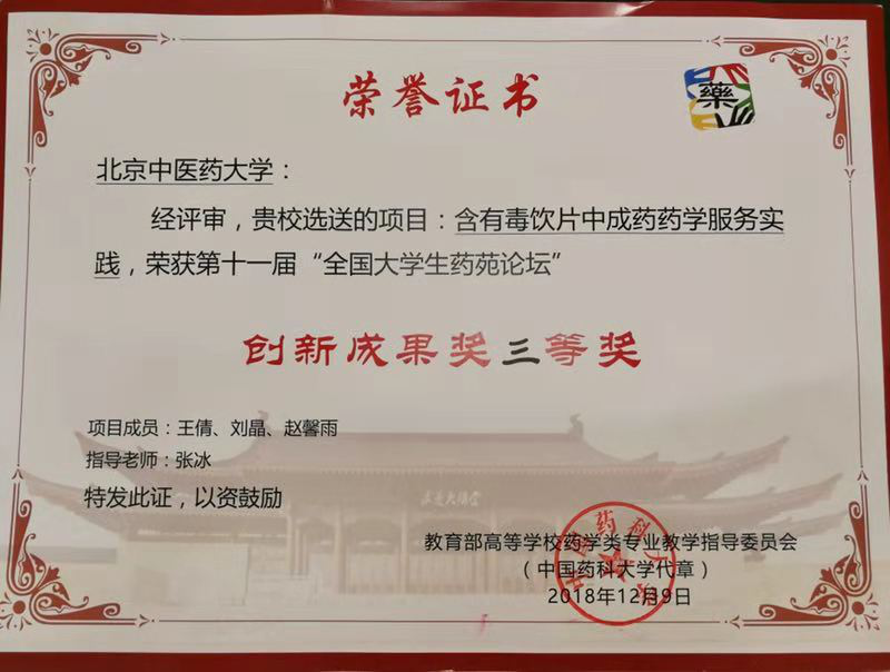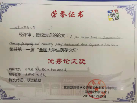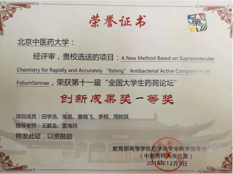 本次比赛分药剂学、中药学、生化药学、药物分析、药理学、药物化学、制药工程七个领域,分壁报交流、论文评选、现场答辩三个比赛环节,最终经过激烈角逐,我校ylzzcom永利总站中药学专业(卓越中药班)和药学班本科生田学浩、张昊、曹晓飞等(参赛作品“A New Method Based on Supramolecular Chemistry for Rapidly and Accurately ‘fishing’ Antibacterial Active Components in Folium Sennae ”获创新成果一等奖及优秀论文奖指导老师:雷海民,王鹏龙),本项目前期获得了2018年大学生创新创业训练项目资助(No.201810026055),这也是该课题组近三年连续指导本科生参加全国大学生药苑论坛并第二次获得创新成果一等奖;此外,中药学专业(卓越中药班)王倩等同学的参赛作品“含有毒饮片中成药药学服务实践”获创新成果三等奖(指导老师:张冰教授)。