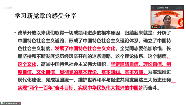 随后,吴清副院长以“奋进新征程,不忘来时路”为主题进行微党课分享。她强调,逾百年的辉煌建设历程让我们愈发坚信中国特色社会主义道路是实现社会主义现代化的必由之路,是创造人民美好生活的必由之路;坚信中国特色社会主义理论体系是指导党和人民沿着中国特色社会主义道路实现中华民族伟大复兴的正确理论,是立于时代前沿、与时俱进的科学理论;坚信中国特色社会主义制度是当代中国发展进步的根本制度保障,是具有鲜明中国特色、明显制度优势、强大自我完善能力的先进制度。同时,她也强调在这场疫情防控战中,中医药扮演的重要作用,让我们更有理由坚信中医药是中国古代科学的瑰宝,也是打开中华文明宝库的钥匙。那么,作为新时代的中医药青年,必须努力奋斗,肩负起中医药繁荣发展的重任。