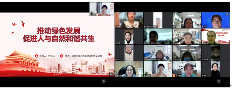为学习贯彻党的二十大精神,进一步全面学习习近平新时代中国特色社会主义思想,推动党的二十大精神进校园、进支部、进头脑,提升学生党员政治理论素养,让听党话、跟党走的信念成为青年大学生的自觉追求,中药生药研究生党支部于2022年11月24日开展线上学习贯彻党的二十大精神党组织生活会。本次党组织生活会由支部书记张子龙老师主持,邀请了马克思主义学院刘亚品老师,带领中药生药研究生党支部全体党员和入党积极分子进行中国共产党第二十次全国代表大会专题学习之《推动绿色发展,促进人与自然和谐共生》。
