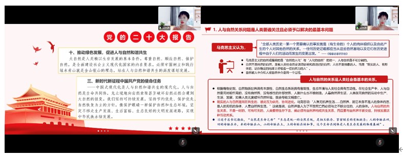 刘亚品老师根据二十大会议报告里的第十条“推动绿色发展,促进人与自然和谐共生”的主题展开介绍:大自然是人类赖以生存发展的基本条件。尊重自然、顺应自然、保护自然,是全面建设社会主义现代化国家的内在要求。必须牢固树立和践行绿水青山就是金山银山的理念,站在人与自然和谐共生的高度谋划发展。接着刘亚品老师以“新时代新征程中国共产党的使命任务--中国式现代化是人与自然和谐共生的现代化”为主题进行重点讲解。人与自然是生命共同体,无止境地向自然索取甚至破坏自然必然会遭到大自然的报复。我们坚持可持续发展,坚持节约优先、保护优先自然恢复为主的方针,像保护眼睛一样保护自然和生态环境,坚定不移走生产发展、生活富裕、生态良好的文明发展道路,实现中华民族永续发展。支部党员认识到人与自然关系发展经历了天人同一、主客相分、和谐共生三个阶段;同时,大家对于党的二十大报告提出的“推动绿色发展、促进人与自然和谐共生”的发展理念有了更加深刻的理解和认识。