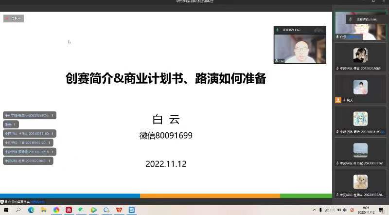 理论课堂部分,白云老师围绕双创大赛的政策与流程、选题指导、高效率且团结的创新创业团队的组建方法、优质商业模式的打造方式、商业计划书的撰写与路演准备、往届优秀获奖案例的解读等六个方面的内容,全过程、多方面的为同学们展开了指导。