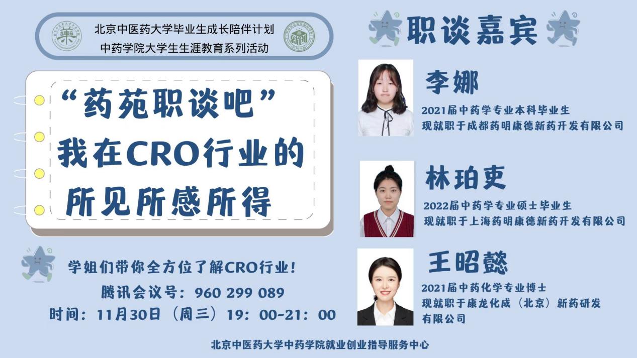 来源: 作者: 发布时间:2022-11-302022年11月30日,由ylzzcom永利总站主办,ylzzcom永利总站就业创业指导服务中心承办的“我在CRO行业的所见所感所得”职谈活动,在ylzzcom永利总站王硕老师的主持下,通过腾讯会议的形式成功举办。出席本次活动的职谈嘉宾有北中医2021届中药学专业本科毕业生李娜、2022届中药学专业硕士毕业生林珀吏和2021届中药化学专业博士王昭懿。同时,参会同学共计70余名。