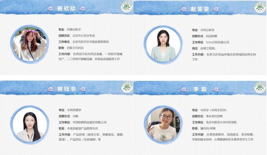 活动伊始,四位优秀校友分别自身工作经验、感受进行分享。目前就职于北京市昌平区市场监督管理局的杨欣欣同学建议有志于进入公务员系统工作的同学务必做好公文写作能力的积累,并且珍惜在校时间积极提升专业技能以外的人际沟通能力和言语表达能力等;目前就职于Sciex分析仪器公司的赵雯雯同学指出,外企的工作氛围与非外企的氛围差别较大,因此有意进入外企工作的同学务必做好准备,同时也要珍惜校内资源,做好专业技能等方面的储备;目前就职于华润双鹤药业股份有限公司的柳钰书同学提醒同学们,国企的氛围并不是传统说的躺平,反而内卷非常激烈,同学们务必调整就业预期,以更加积极的形态求职就业;目前就职于ylzz总站线路检测李阳同学也结合自己的求职经历和工作经验提醒同学们,求职道路千万条,不要被某一条道路束缚了手脚,只要敢想敢做,美好未来大有可为。