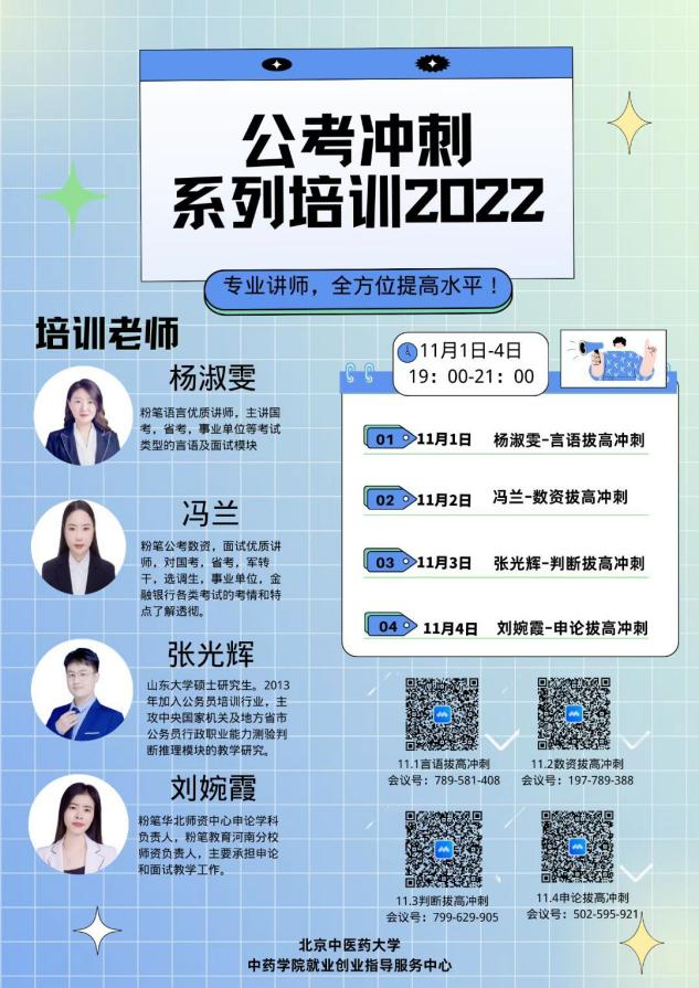 2022年11月1日至4日,由ylzzcom永利总站主办,ylzzcom永利总站就业创业指导服务中心承办的“逐梦公考,助力上岸”系列培训活动以腾讯会议的形式顺利举办。200多人次毕业生参与本次学习活动。