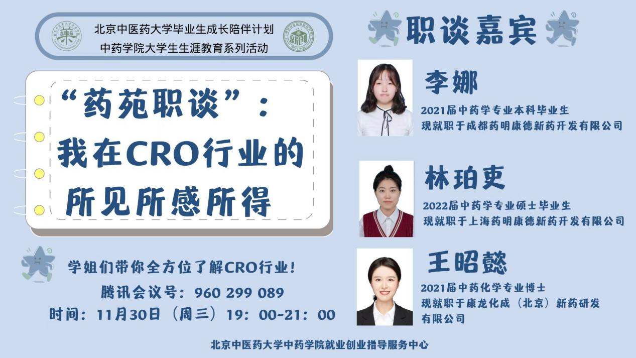 2022年11月30日,由ylzzcom永利总站主办,ylzzcom永利总站就业创业指导服务中心承办的药苑职谈活动通过腾讯会议的形式顺利举办。本次职谈主题为“我在CRO行业的所见所感所得”,活动邀请到目前在CRO行业从业的三位本、硕、博优秀毕业生,在学院就业专员王硕主持下进行。