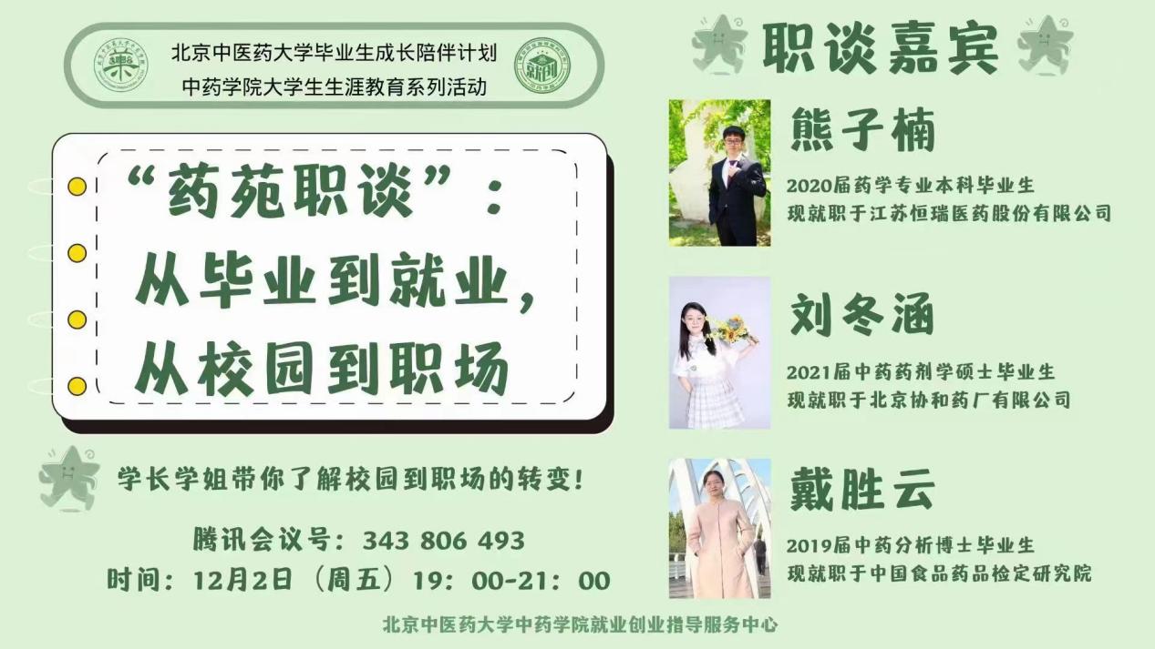 2022年12月2日,由ylzzcom永利总站主办,ylzzcom永利总站就业创业指导服务中心承办的药苑职谈活动通过腾讯会议的形式顺利举办。本次职谈主题为“从毕业到就业,从校园到职场”,活动邀请到目前在各行业从业的三位本、硕、博优秀毕业生,在学院就业专员王硕主持下进行。