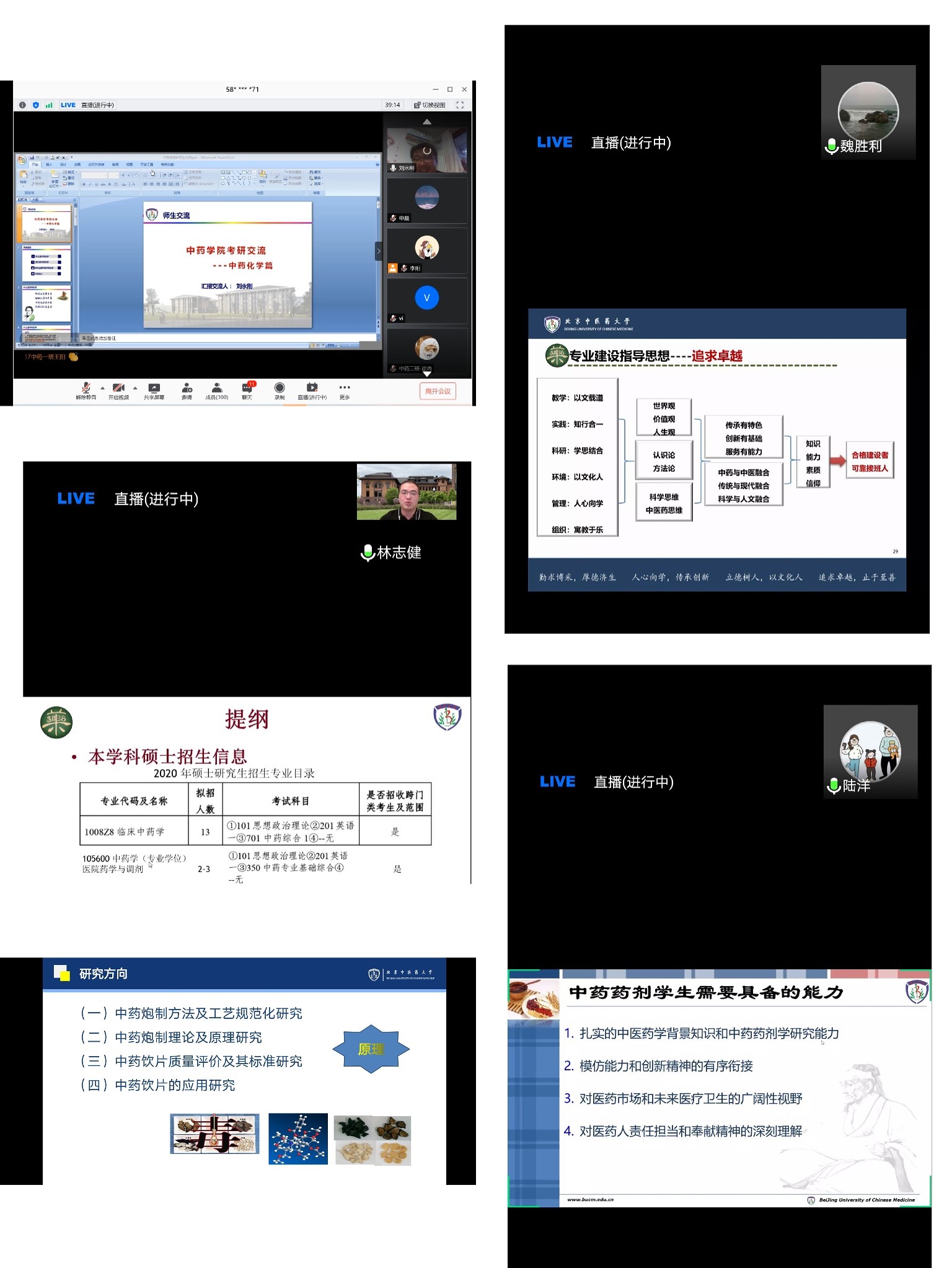 7月25日,ylzzcom永利总站通过线上形式组织开展了中药学方向考研指导系列讲座暨交流会第一场活动。活动特别邀请了中药资源学魏胜利教授、中药化学刘永刚教授、中药炮制学杜红教授、临床中药学林志健副教授、中药药剂学陆洋教授,老师们从二级学科特色、重点与优势、毕业生就业前景等方面做了报告分享,会议由学院党委副书记李维峰老师主持。会议设有直播分会场,在线参会学生数高达380余人。