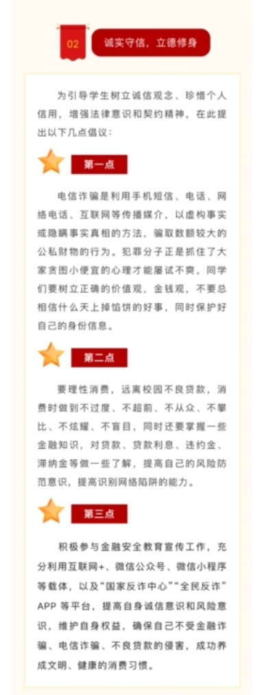为全面贯彻落实党的二十大精神,深入学习贯彻习近平新时代中国特色社会主义思想,切实践行习近平总书记关于教育的重要论述精神,引导学生树立正确的消费观、成才观和价值观,增强当代大学生的诚信意识和责任意识,提高当代大学生的风险意识和感恩意识,ylzzcom永利总站于今年5月-6月面向学院全体学生开展诚信教育。活动重点把握关键时间节点,引导学生树立诚信观念、珍惜个人信用,增强法律意识和契约精神;开展诚信及金融知识普及教育,防范金融诈骗、电信诈骗、不良校园贷等方面的知识,现总结如下: