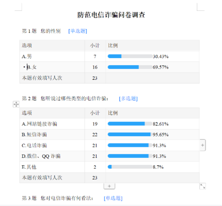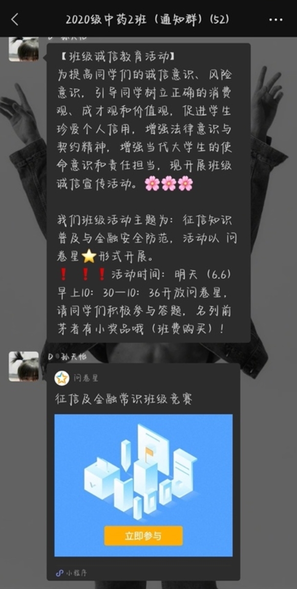 有的班级采取问卷星的形式,在班级中开展知识竞赛,检验和普及金融常识,组织班级全员参与,踊跃作答。在作答的过程中,向同学们普及相关知识,接受诚信、防诈骗教育。