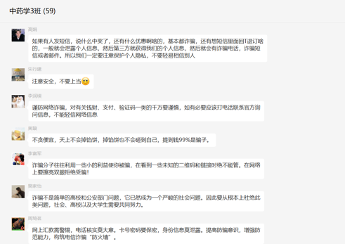 有的班级借助网络媒体,通过组织同学们观看专题视频、微电影、电影等,通过真实案例、警示教育片,开展主题教育内容,向同学们传递了诚信的重要性,普及了常见的诈骗手段。观看结束后,班级同学利用腾讯会议、班级群等平台,进行热烈讨论,发表自己的见解,共同学习交流。