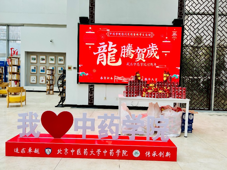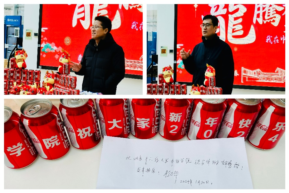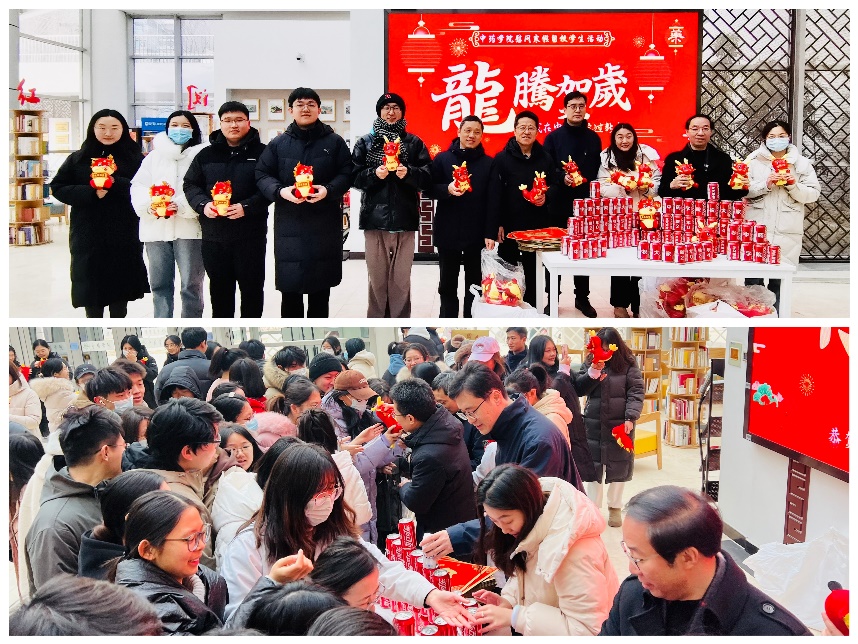学院领导依次向留校学生分发春联、福字、窗花、定制可乐、龙年玩偶、牛奶等新春慰问品。现场气氛热烈,其乐融融,全体师生共同发出“新年快乐”的祝愿,祝福大家龙行龘龘、前程朤朤。
