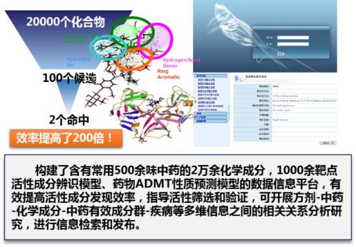 (4)融合药性理论科学内涵、中药功效markers解析、多尺度中药作用机制解析等研究成果,建立了基于中医古籍方剂数据库挖掘、针对疾病靶标-通路的现代药物设计等多技术方法的中药新药设计方法和平台。
