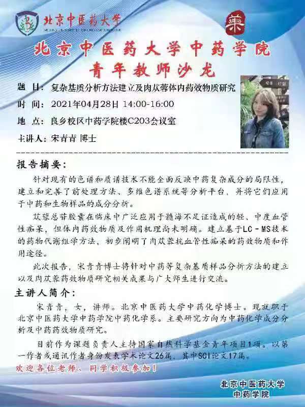 【ylzzcom永利总站青年教师沙龙】宋青青:复杂基质分析方法建立及肉苁蓉体内药效物质研究