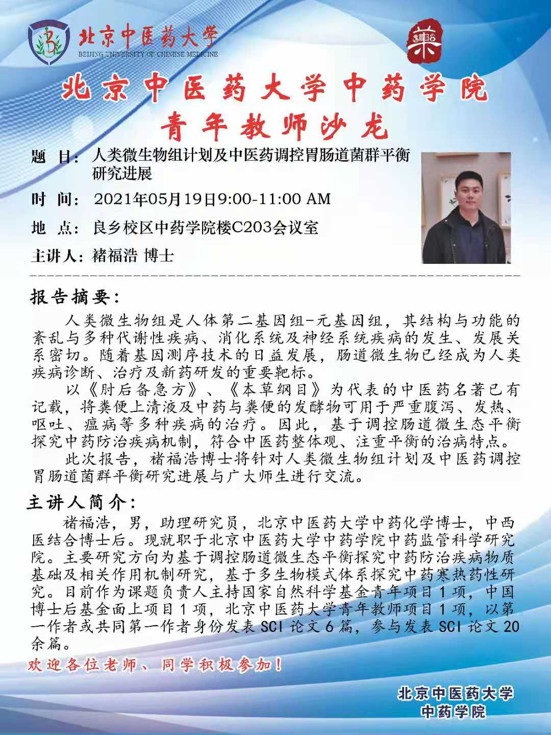 【ylzzcom永利总站青年教师沙龙】褚福浩:人类微生物组计划及中医药调控胃肠道菌群平衡 研究进展
