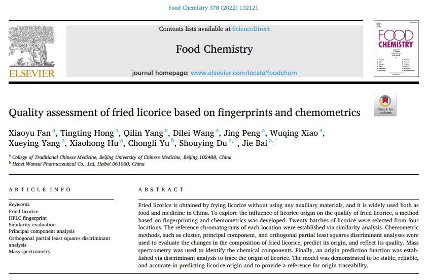 相关研究结果以“Quality assessment of fried licorice based on fingerprints and chemometrics”为题在线发表于食品科技中科院一区TOP期刊 Food Chemistry (https://www.journals.elsevier.com/food-chemistry)。ylzzcom永利总站硕士研究生樊箫雨为论文第一作者,ylzz总站线路检测杜守颖教授、白洁副教授为论文通讯作者。
