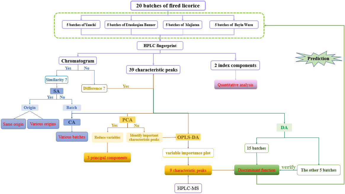 炒甘草,由甘草清炒制成,与甘草功效不同,在临床和日常生活中具有广泛应用。目前甘草在国内的主产地位于中国西北部,其质量易受产地的地理位置、土壤、气候和生态环境的影响而不同,但由于其化学成分的复杂性及产地的多样性,目前少见对不同产地炒甘草的差异性分析的报道。为了探讨甘草产地来源对炒甘草质量的影响,ylzzcom永利总站杜守颖教授团队建立了一种基于化学计量学和成分分析评价不同产地炒甘草质量属性的方法。从四个产地了采购20批甘草药材,炮制成炒甘草后对其进行研究分析。首先通过相似度分析建立了四个产地炒甘草的对照图谱,然后引入化学计量学方法,利用聚类分析直接分析来自不同产地炒甘草的批间一致性,说明不同产地间炒甘草的相似性;主成分分析确定三个主成分,初步确定最能说明差异来源的成分簇,体现不同产地间炒甘草的差异性;进一步引入正交偏最小二乘鉴别分析,通过变量重要性图直接定位受产地影响最大的色谱峰;再由质谱分析确定这些色谱峰所代表的化合物;最后,以这些化合物为变量,建立判别函数模型预测其来源。经检验,预测函数正确性较高,可用于鉴别炒甘草的产地。该项研究建立的四维质量评价方法简便易行,为甘草资源的开发利用和中药及其他相关食品药品的真伪鉴别、质量评价及开发利用提供参考。