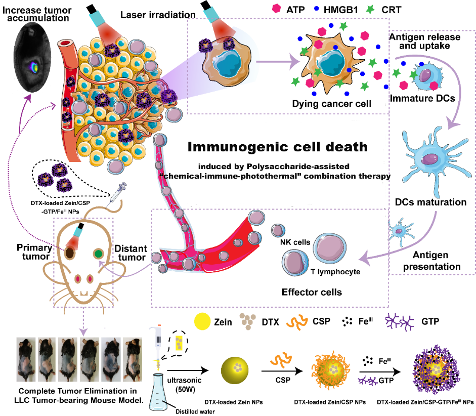我院杜守颖教授、陆洋教授团队选取化疗药物多西他赛、光敏剂(茶多酚/铁离子膜)以及锁阳多糖形成“化学-免疫-光热”联合疗法模式,其中化疗与光热治疗联用可诱导产生强于单一疗法的ICD效应,锁阳多糖调节免疫系统,进一步放大ICD效应,帮助机体建立持久的抗肿瘤免疫应答。此外,将联合疗法模式与纳米运载体技术相结合,构建“一体化”的载药纳米平台,用于癌症的靶向治疗,进一步提高了抗肿瘤疗效。该载药纳米平台在不同的荷瘤小鼠模型中均能显著抑制原位瘤及远端瘤的生长,且具有良好的生物安全性。这种基于中药多糖的“一体化”载药纳米平台为中药多糖在癌症治疗中的应用提供了理论指导及实验基础。