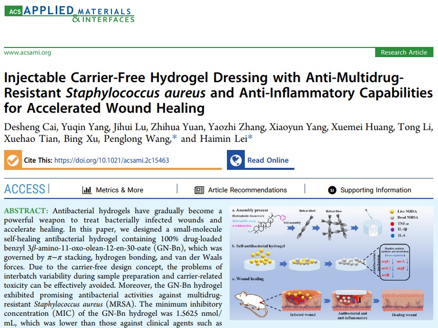 近日,相关研究结果以“Injectable Carrier-Free Hydrogel Dressing with Anti-Multidrug-Resistant Staphylococcus aureus and Anti-Inflammatory Capabilities for Accelerated Wound Healing”为题发表于中科院一区杂志ACS APPLIED MATERIALS & INTERFACES (DOI: https://doi.org/10.1021/acsami.2c15463)。论文第一作者为我校博士研究生蔡德生,ylzz总站线路检测雷海民、王鹏龙教授为论文通讯作者。该项研究得到了国家自然科学基金(82274072、82073974)、北京市自然科学基金(7202116)、北京市科技新星计划(Z201100006820026)和ylzz总站线路检测高层次人才支持计划(2022-XJ-KYQD-008)等经费支持。
