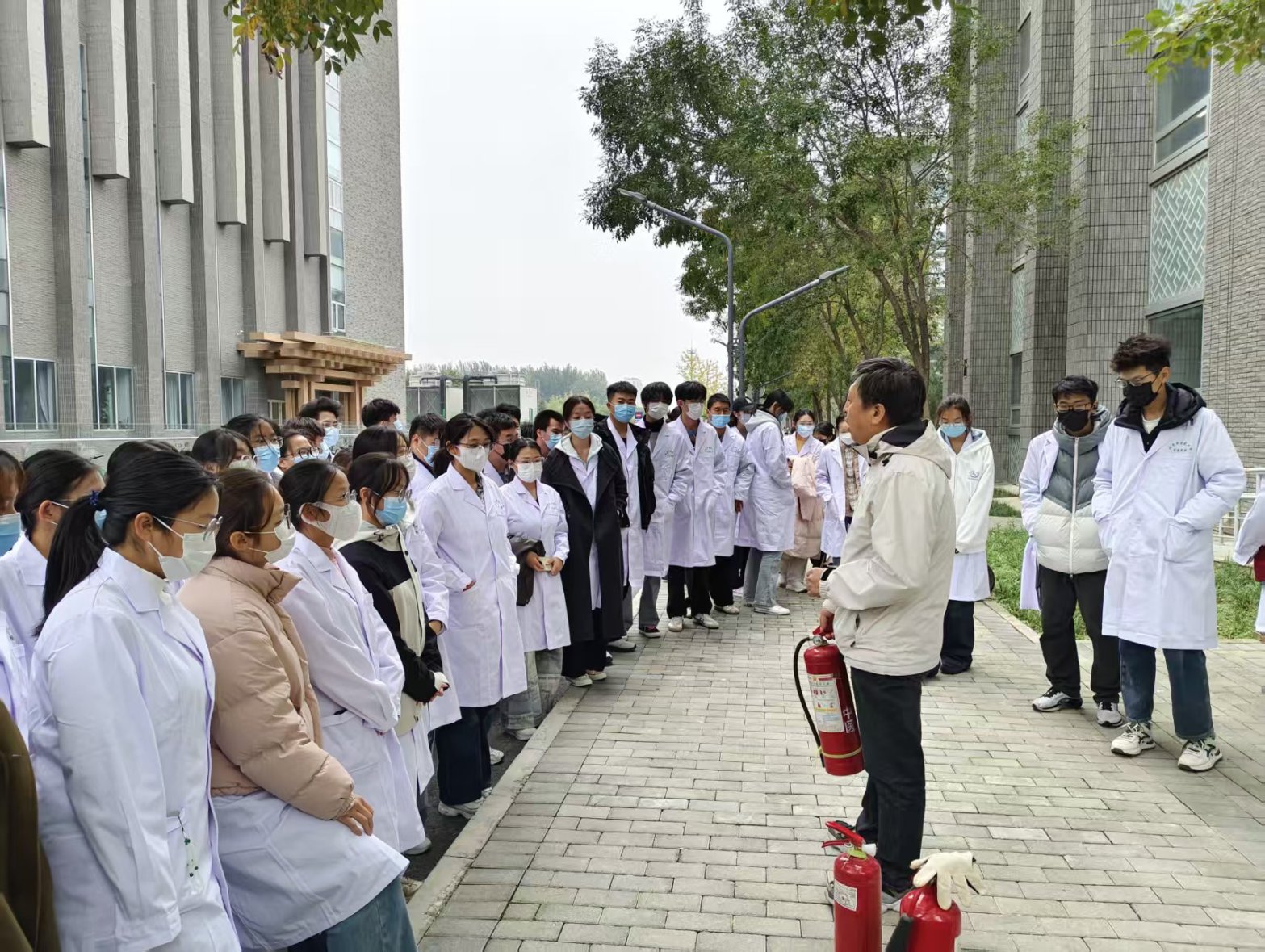 为实现“知行合一”的培训目标,保卫处王爱民老师聚焦实操技能提升,逐一讲解实验室常用两种类型的灭火器、楼道内消火栓及安全应急柜的构造原理、操作步骤与安全注意事项。在现场示范中,他精准演示了灭火器 “提、拔、握、压” 的标准动作,强调了不同火情下器材选择的关键要点。随后,全体学生依次参与灭火器实战灭火体验,在专业指导下完整完成火情判断、器材操作等实操流程,切实掌握了基础灭火技能。