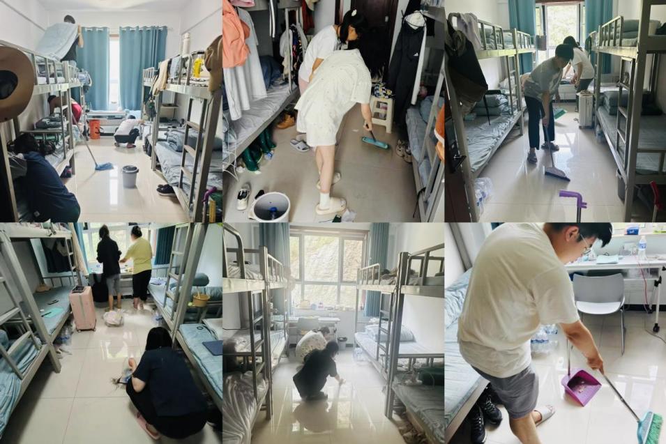 在完成各自宿舍的内务整理之后,延伸至宿舍楼内的公共区域。大家分工明确,在整个清扫过程中,同学们充分发扬了团结协作的精神,不怕脏、不怕累,认真细致地清理每一个角落。大家相互配合,默契无间,整个劳动过程井然有序,最终顺利且高效地完成了既定的劳动任务。在最后即将离别之际,同学们又整体进行了二次劳动大清扫,将基地宿舍区域恢复成刚开始到来时的模样。通过这两次的“宿舍焕新行动”,不仅提升了宿舍的卫生环境,更培养了学生们的劳动意识和团队合作精神,达到了预期的劳动教育效果。