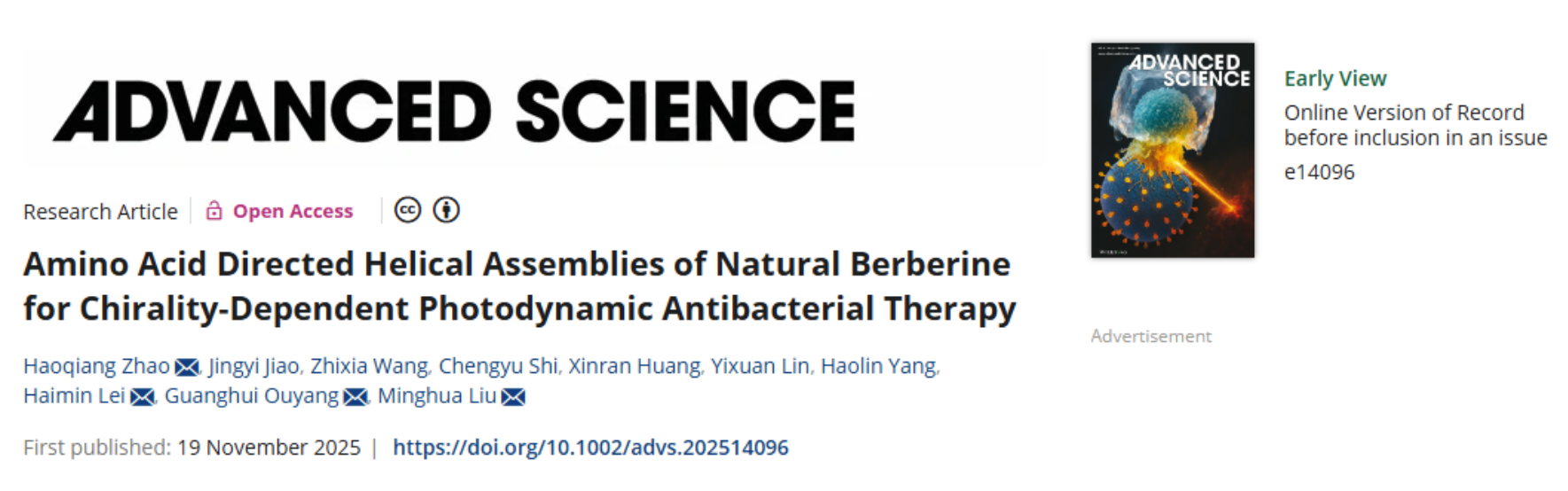 来源: 作者: 发布时间:2025-11-20近日,ylzzcom永利总站联合中国科学院化学研究所在国际权威期刊《Advanced Science》(中科院1区TOP期刊,IF: 14.1)发表题为《Amino Acid Directed Helical Assemblies of Natural Berberine for Chirality-Dependent Photodynamic Antibacterial Therapy》的研究论文。该研究由ylzzcom永利总站赵浩强领衔,联合ylzz总站线路检测雷海民教授,中国科学院化学研究所欧阳光辉、刘鸣华研究员团队共同完成。该研究首次利用天然中药活性成分小檗碱(Berberine, BBR)与手性氨基酸衍生物进行可控组装,成功构建了具有明确超分子手性且镜像对称的螺旋纳米纤维,并揭示了其“手性依赖”的光动力抗菌机制。该研究不仅为理解中药复杂体系的多层次药效作用提供了全新视角,也为开发高效、精准的天然药物递送与治疗平台开辟新路径。