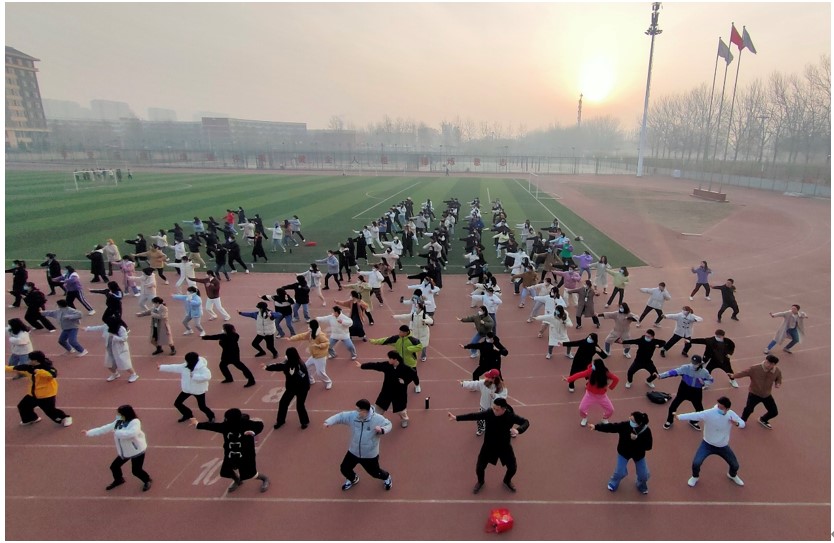 最后,在蓬勃的朝阳之下,两位领操员带领同学们一起做八段锦操。雷院长和任书记也与同学们一同锻炼,以实际行动鼓励研究生们强身健体,以更加昂扬向上的精神面对科研路上的重重挑战。