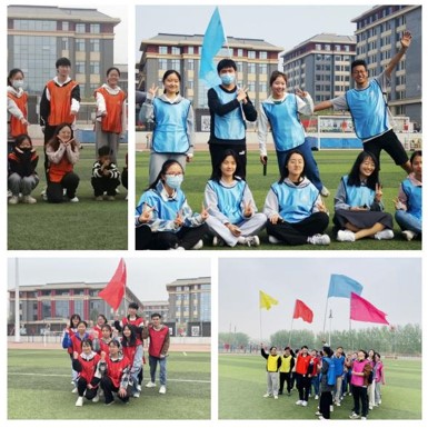 短暂热身后,同学们随机排列,快速组队,并派代表选择训练服。各小队快速选定队长、队秘及旗手,紧锣密鼓地确定队名,绘制队旗,设计口号,筹备阵容,最终形成了风采炸裂的8支队伍,各队伍摆着欢乐的姿势,挥舞着欢快的旗帜,洋溢着青春的氛围。