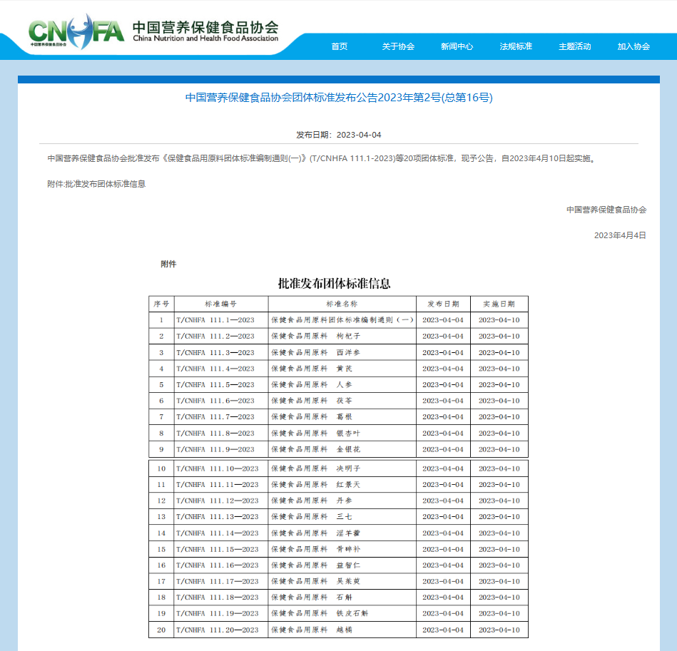 2023年4月4日,中国营养保健食品协会2023年第2号公告发布包括《保健食品用原料团体标准编制通则 (一)》 (T/CNHFA 111.1-2023)等在内的首批20项保健食品用原料(中药材)团体标准,自2023年4月10日起实施。该系列团体标准在制订过程中尊重传统与食品属性,依据保健食品用原料的自身特点和监管政策开展研究。标准在必设检验项目的基础上,结合各品种的特性再增设安全性和有效性检测项目,充分体现出该系列标准“食品味”和“中药味”的双重属性。该系列团体标准研究工作的开展对于加强源头标准建设,减少保健食品行业乱象,推动行业的健康发展具有重要意义。