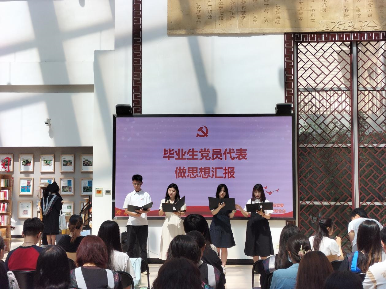 中药本科生党支部粟赵雨晴同志、制药本科生党支部王子恒同志、中药化学研究生第一党支部陈可点同志、中药化学研究生第二党支部邹秋玉同志,一起向党组织做毕业前最后一次思想汇报,共同在回望来时路的过程中坚定矢志不渝、奋斗终身的决心。
