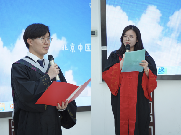 19中药4班本科生张健宇、19博生班研究生汤如莹作为毕业生代表发言。张健宇同学回顾了课程学习、学生活动、志愿服务等难忘的大学时光,发出了“脚踏实地,使命在肩”的毕业誓言。汤如莹同学分享了科研道路的挫折与喜悦,表达了对母校和老师和感恩之情。