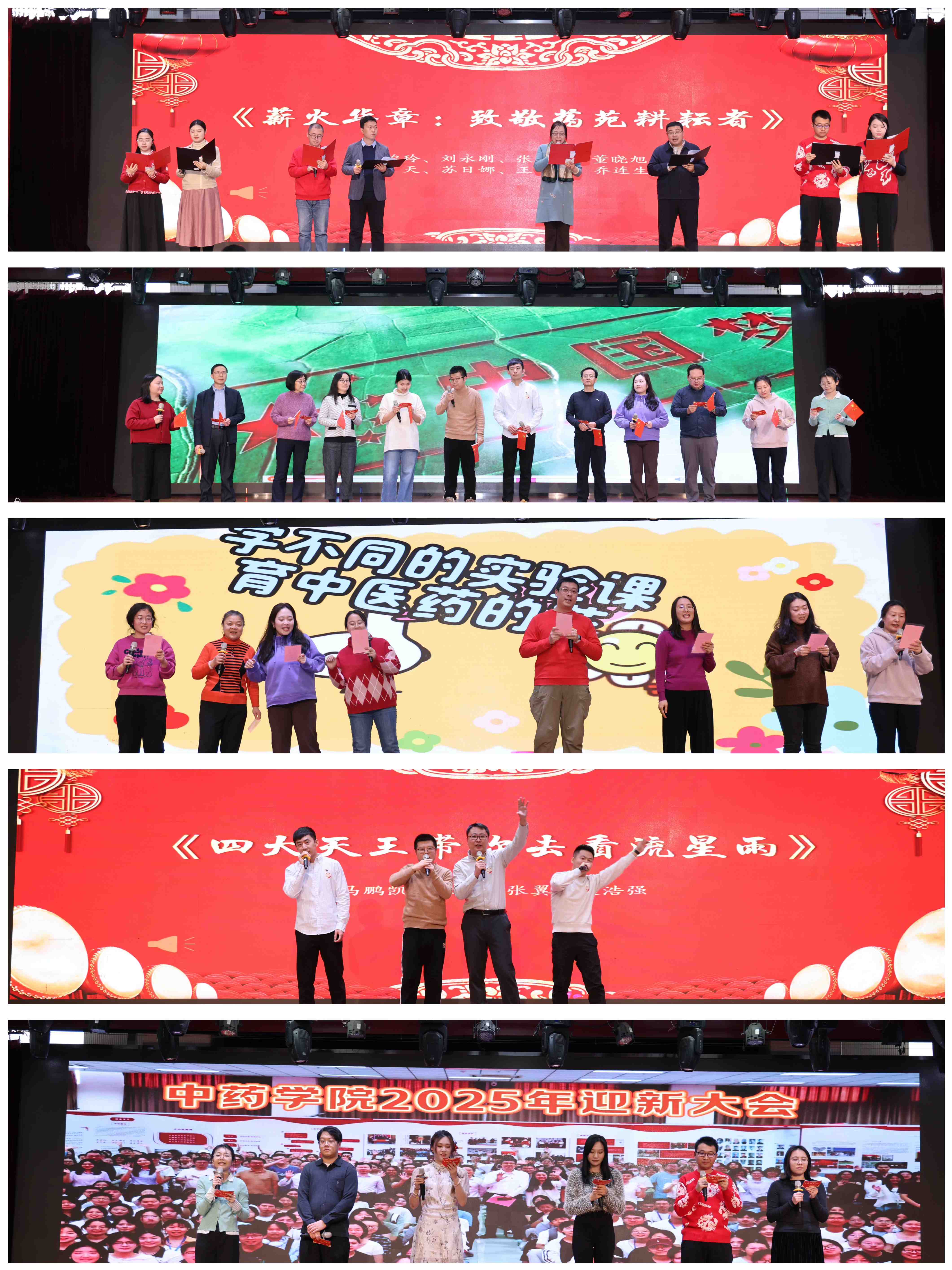 于此同时,精彩绝伦的文艺表演与互动环节也将现场氛围推向了高潮。朗诵《薪火华章:致敬药苑耕耘者》声情并茂,深情诉说着药院人在讲台、实验室、田间地头默默坚守与无私奉献的动人故事,让在场的每一个人都为之动容。合唱《我和我的祖国》激昂澎湃,唱出了教职工们深厚的家国情怀;《在药苑里育中医药的花》悠扬婉转,表达了大家对学院的无限热爱与眷恋;而《四大天王带你去看流星雨》则以轻松幽默的方式展现了药院人充满活力与趣味的一面,引得现场笑声不断。