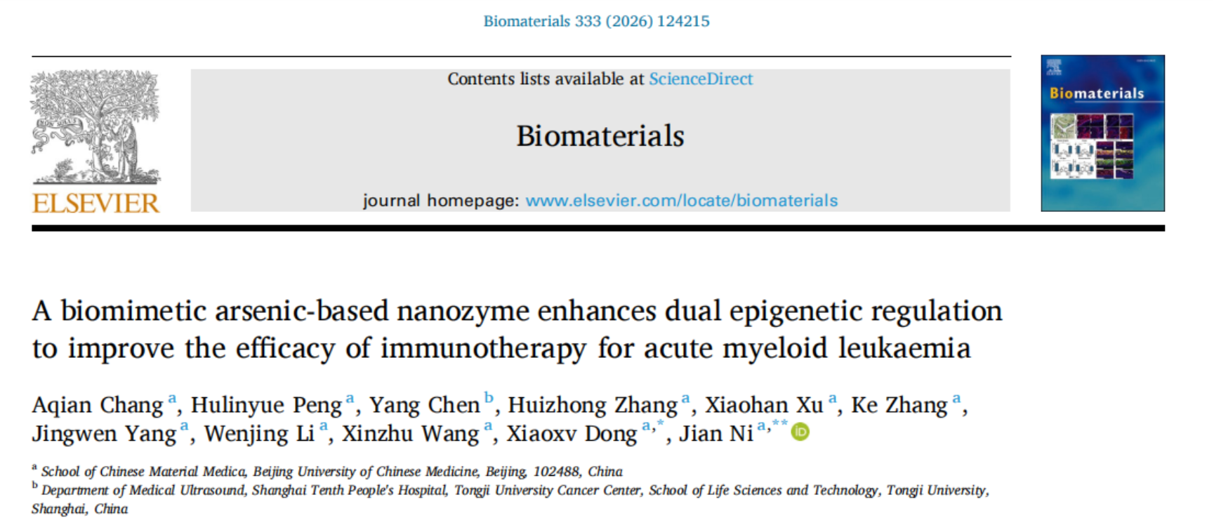我校ylzzcom永利总站团队在Biomaterials发表砷基仿生纳米酶治疗急性髓系白血病最新研究成果