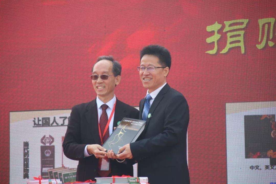 纪念大会上,药77级校友、赵教授捐赠了精心力作《中振说本草》、《中药材鉴别图典》等书。中药专业首届本科校友张世臣捐赠了自己珍藏多年的中药高等教育创立初期教材初稿。